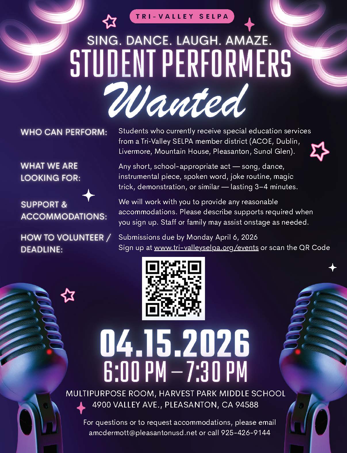 Disclaimer: The Tri-Valley SELPA does not guarantee the accuracy of any information contained in these flyers nor does it endorse any of the activities, events, services, products or agencies represented therein.